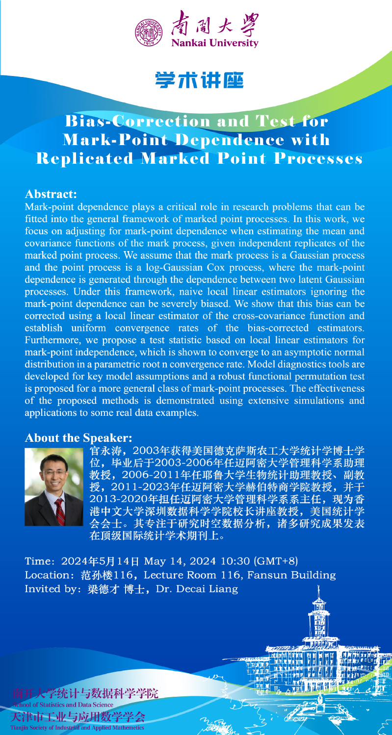 Bias-Correction and Test for Mark-Point Dependence with Replicated Marked Point Processes(官永涛)