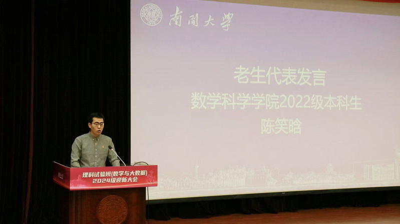 数学科学学院2022级本科生陈笑晗作为老生代表发言。他回顾了学科辉煌历史,鼓励学弟学妹们怀揣梦想、脚踏实地,用汗水和智慧创造未来,携手书写新的辉煌篇章。