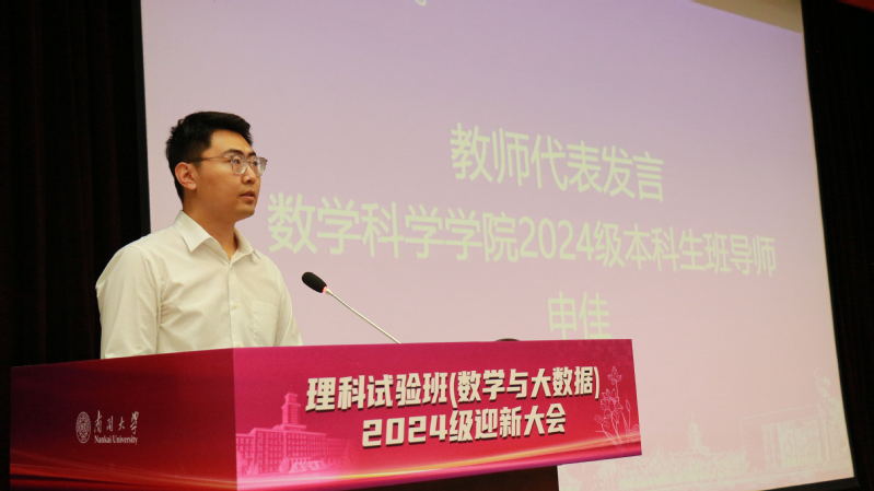 数学科学学院班导师代表申佳发言。他给新生提出了宝贵的学习生活建议,包括重视身心健康、专注学习并锻炼思维、积极与同学交流合作、勇于探索未知参与活动,期望同学们珍惜大学时光,勇敢追求梦想,书写青春篇章。