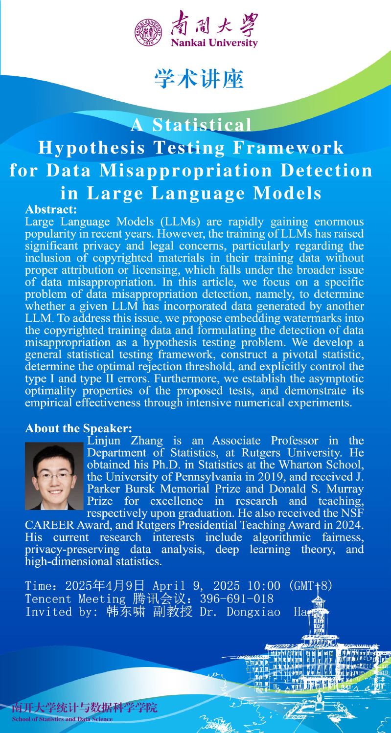 A Statistical Hypothesis Testing Framework for Data Misappropriation Detection in Large Language Models(Linjun Zhang)