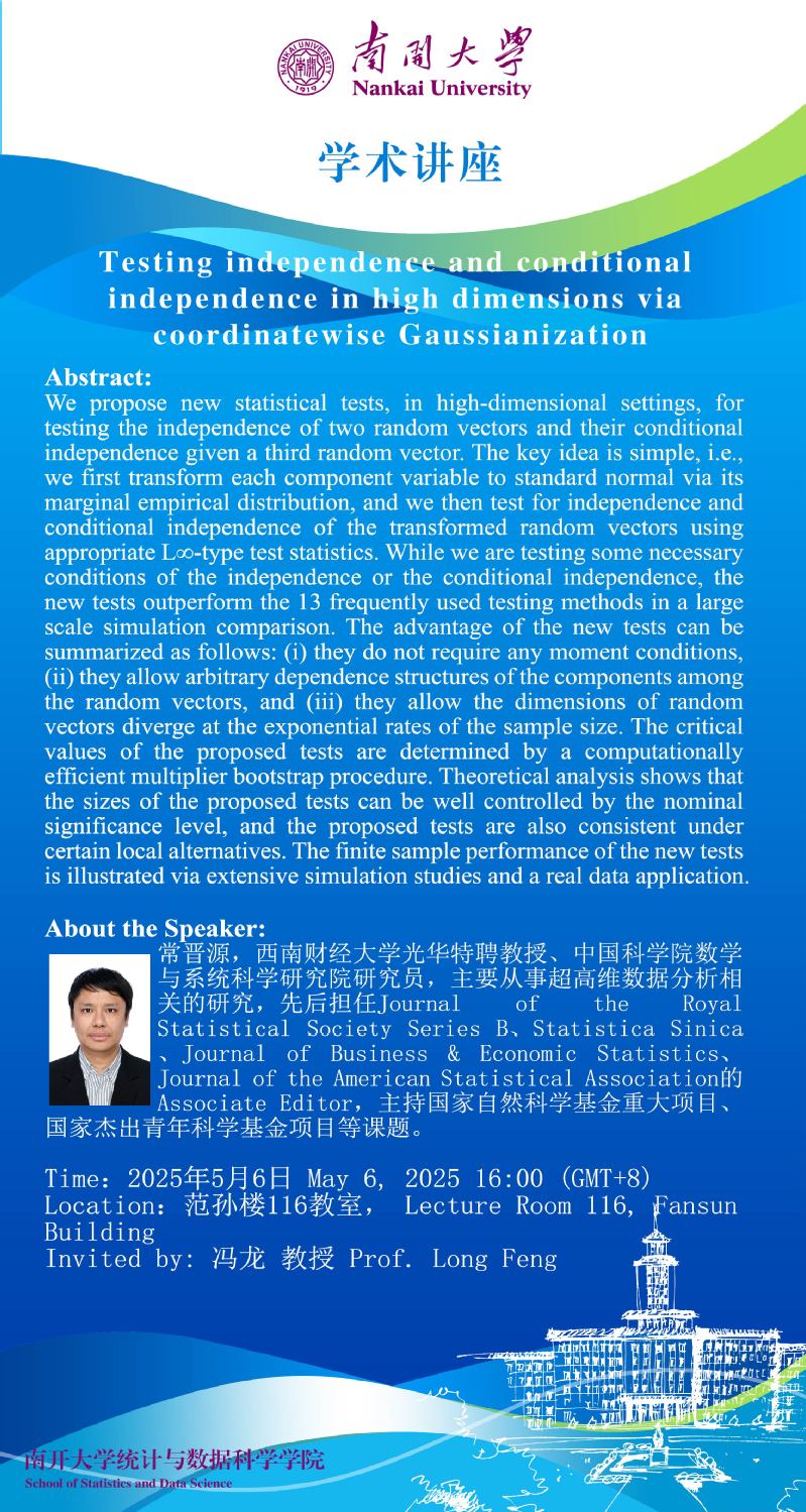 Testing independence and conditional independence in high dimensions via coordinatewise Gaussianization(常晋源)